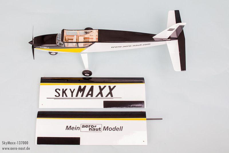 SkyMAXX ist ein Trainer-Modell für die Steuerung über drei Achsen und eignet sich besonders für die Einführung in den Motorflug. Das Modell ist ein Holz-Bausatz mit passgenau lasergeschnittenen Teilen. Die Tragflächen werden auf einer speziellen Helling verzugsfrei aufgebaut. Für den Antrieb werden passende Spantensätze für Elektro- und Verbrennungsmotoren mitgeliefert. Kabinenverglasung, Cockpitausbau mit Instrumentenbrett und Pilotensitz sowie große Reifen sorgen für eine attraktive Optik und gute Startmöglichkeiten von gemähten Graspisten.