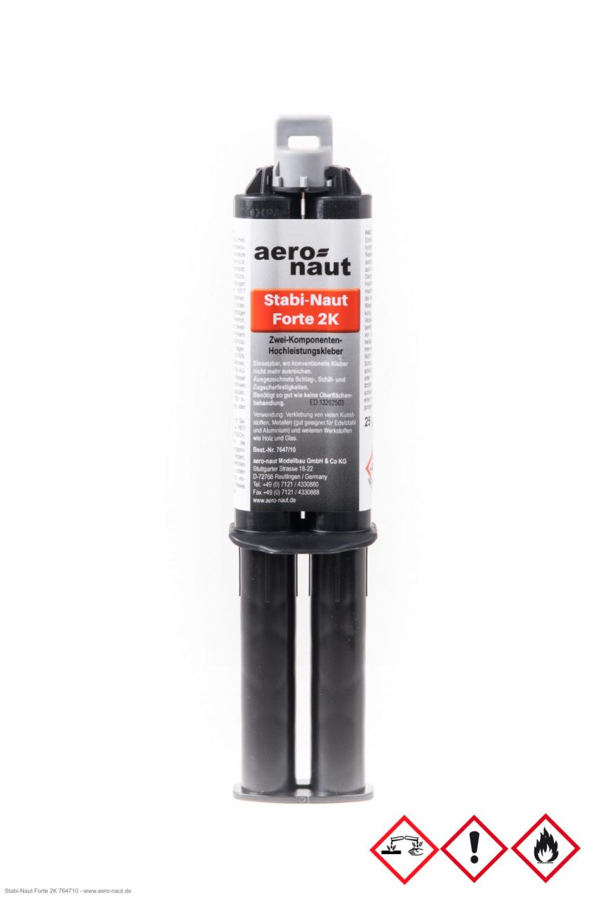 Stabi-Naut Forte 2K ist ein leistungsstarkes Zweikomponenten-Klebesystem, entwickelt für anspruchsvolle Anwendungen im Modellbau. Als Alternative zu Stabilit-Express bietet es hohe Schlag-, Schäl- und Zugscherfestigkeit sowie Beständigkeit gegen Feuchte und Temperaturschwankungen. Der Kleber verbindet unterschiedlichste Materialien (ABS, GfK, CfK, Polycarbonat, Metalle, Holz, Keramik) und eignet sich besonders für Schiffs- und Flugmodelle sowie wärmebelastete Bauteile.
