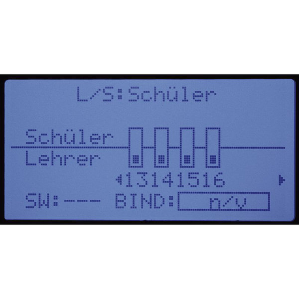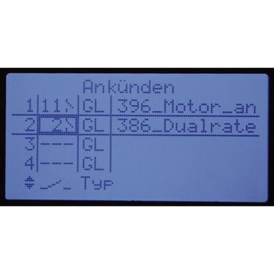 - Ein kontrastreiches blau beleuchtetes Grafikdisplay gewährleistet perfekte Kontrolle der Einstellparameter wie Modelltyp, Modellspeicher, Uhren und der Betriebsspannung.