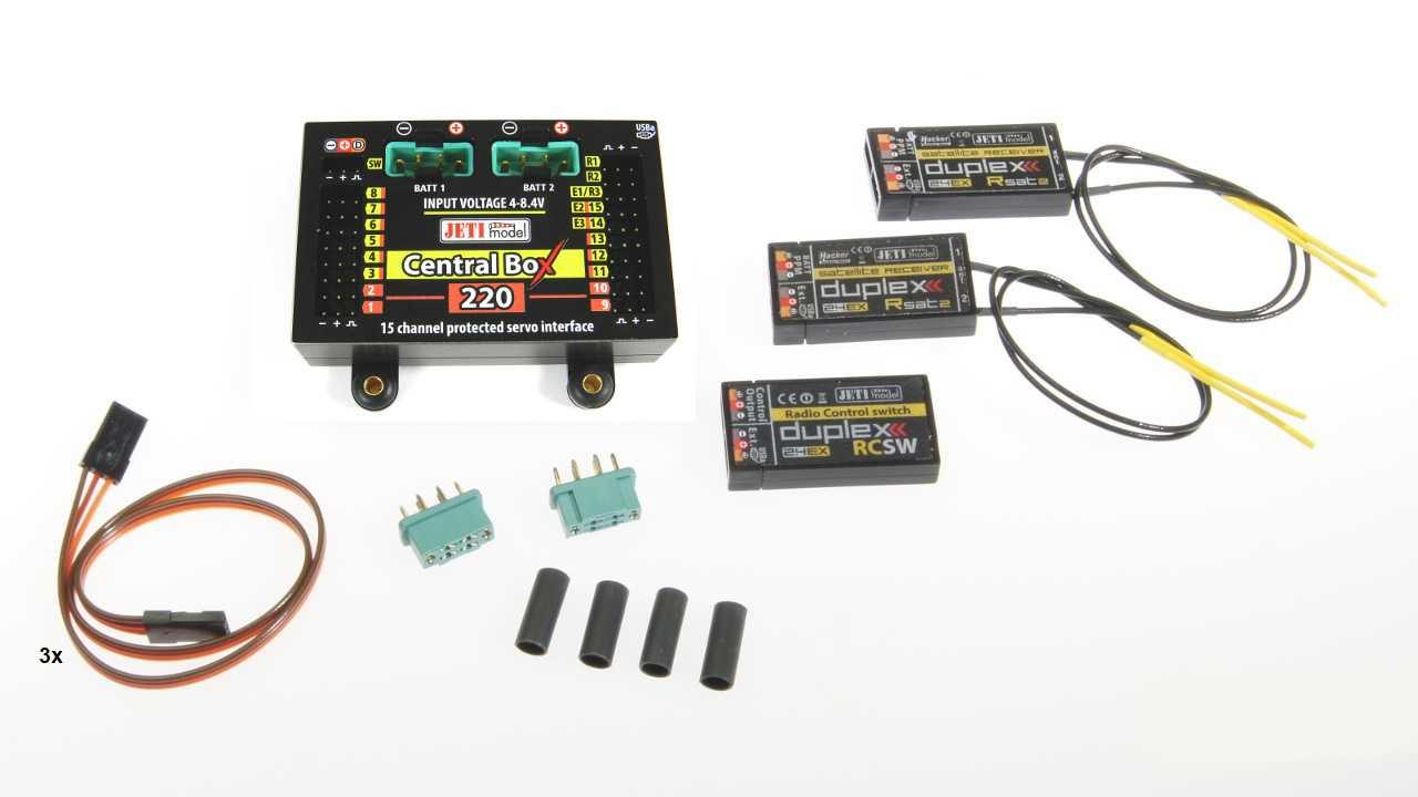 1 JETI Duplex 2.4EX Central Box 220, 1 RC-Switch, 2 JETI Duplex 2.4EX RSat2-Empfänger und 3 Patchkabel.