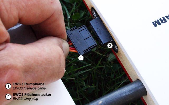 Als Gegenstück zum EWC6-Rumpfkabel gibt es den separat erhältlichen EWC6-Flächenstecker (siehe Reiter Zubehör) zum Anschrauben in der Wurzelrippe.