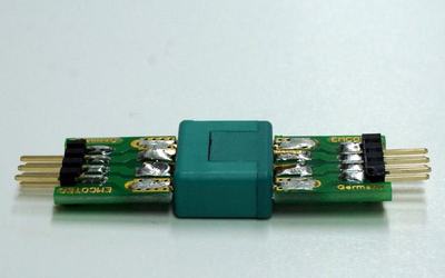 Die Servo- oder Beleuchtungskabel werden an der Stiftleiste auf der Platine angesteckt und mit den mitgelieferten Schrumpfschläuchen fixiert. Die mit dem Schrumpfschlauch umschlossene Platine dient als Griff zum einfachen An- und Abstecken.