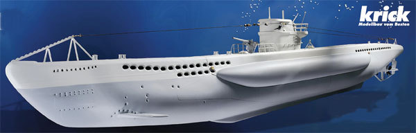 Der Rumpf des U-Bootes Typ VII b besteht aus zwei ABS-Halbschalen, dem Tauchtank, Ballasttank sowie dem aus dünnem Material tiefgezogenen Deck, damit alle Schlitze und Öffnungen gut zu erkennen sind.
