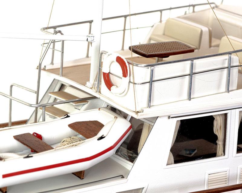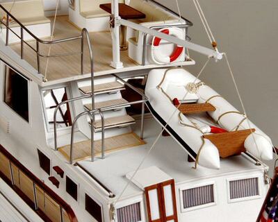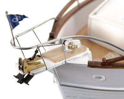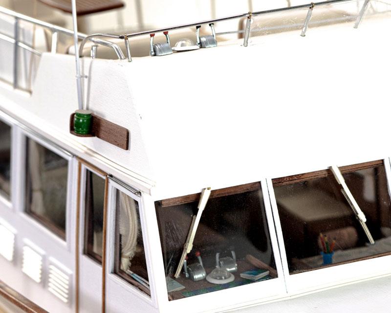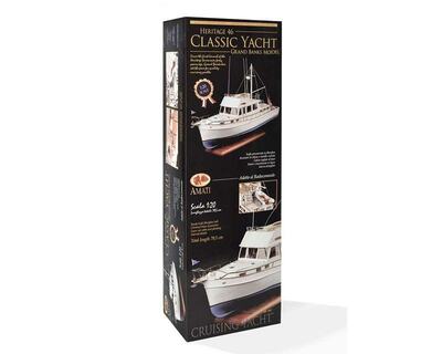 Detailgetreue Reproduktion einer klassischen Grand Banks Motoryacht, deren ursprüngliches Design auf das Jahr 1967 zurückgeht. Die Konstruktion basierte ursprünglich auf einem Trawler-Rumpf, wie sie typisch in Nordamerika und auch in Neufundland waren, wo die Werft zu Hause ist.