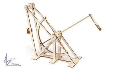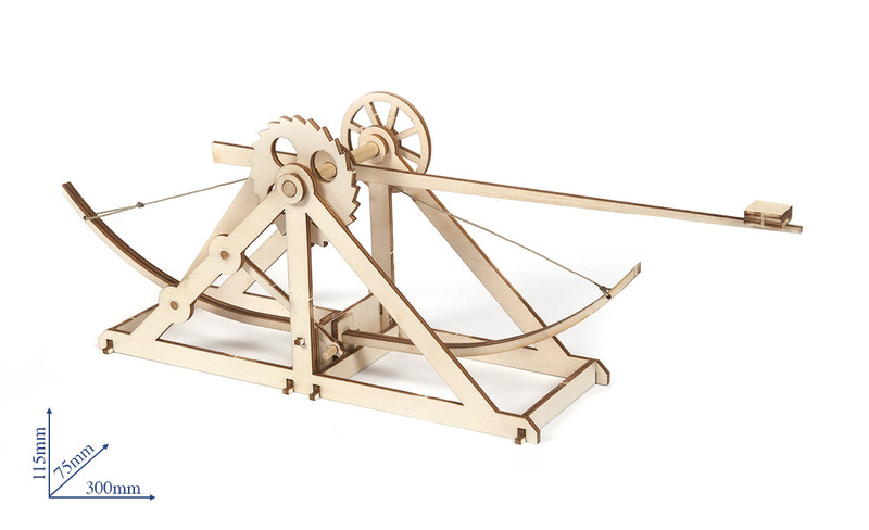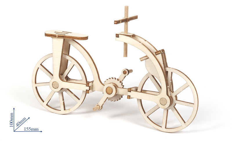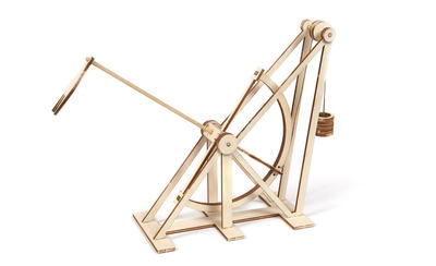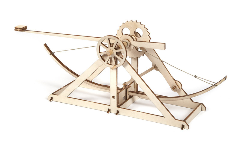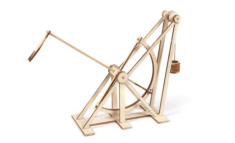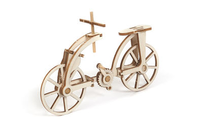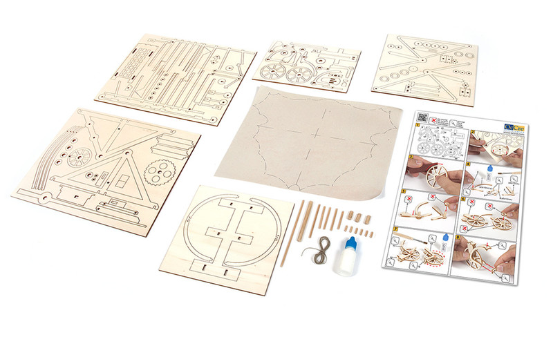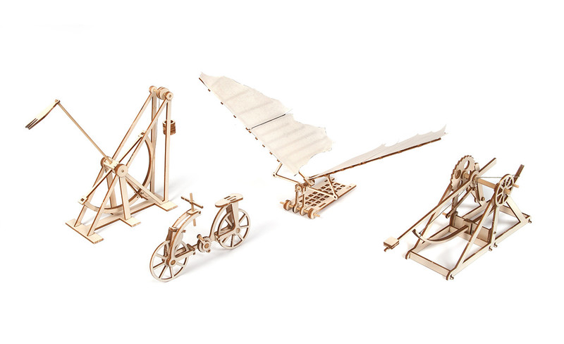 Modellbausatz mit vier Maschinen von Leonardo Da Vinci: Fahrrad, Flugmaschine, Bagger und Katapult. Die Modelle lassen sich einfach zusammenbauen.