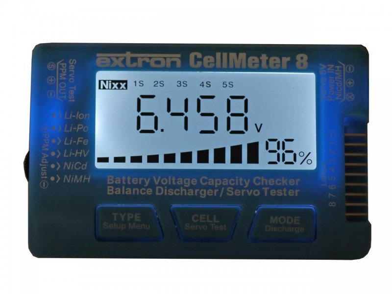 Das Cell Meter 8 ist ein Multifunktions-Messgerät, mit dem die Kapazität Ihrer Akkus sowie die Einzelzellenspannung messen können. Darüberhinaus kann das Cell Meter 8 Ihre Lithium Akkus balancieren und Ihre Servos testen. Nettes Feature am Rande: Das Gerät verfügt über eine sehr schöne, helle Hintergrundbeleuchtung.