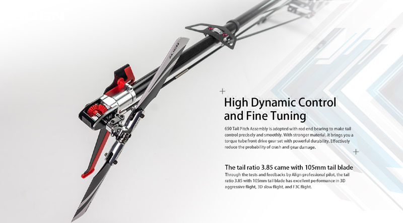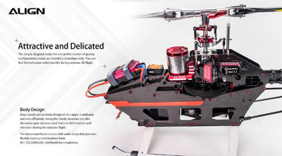 The Airspace DominatorDer neue ALIGN T-REX 650X besitzt ein einzigartiges Rahmendesign. Er verfügt über ein getrennten Hauptrahmen, einen schmalen oberen Rahmen und einen breiteren unteren Rahmen. Ideal um die Struktur zu stärken und bequem zu reparieren. Als Flugakku kommt entweder ein 6S LiPo mit 5200-6000mAh zum Einsatz. Außerdem gibt es viele nette Funktionen, wie einen neuen Schnellverschluss für den Akku, deutlich sichtbare Farben am vertikalen Leitwerk, den Hauptrotorblättern und der Kabinenhaube, welche zudem mit einem neuen Magnetverschluss ausgestattet wurde. Die Flugleistung ist eine Kombination aus hoher Stabilität des 700er und der hohernAgilität eines 600ers.