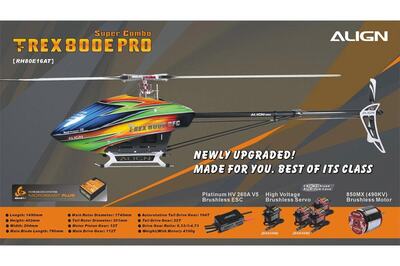 Der T-REX 800E PRO kann als das aktuelle Flaggschiff der überlegenen Produktlinie von Align bezeichnet werden. Basierend auf dem Stammbaum des reinen 3D-Fluges, dem neuesten Designkonzept mit absoluter Top-Ausstattung, zusammen mit