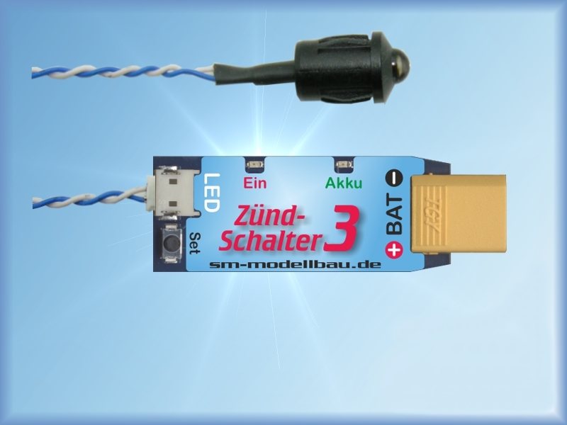 Zusätzlich zu den zwei eingebauten Kontroll LEDs wird jetzt auch noch eine externe LED mitgeliefert, die an den Zündschalter 3 angeschlossen werden kann. Diese wird dann in der Rumpfwand montiert und ermöglicht eine einfache Kontrolle des Schaltzustandes.