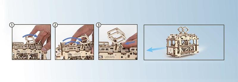 In Anlehnung an diese Großstadtwelt hat der Markenhersteller UGEARS® eine mechanische Stadt ins Leben gerufen, welche als 3D-Modell das Fortbewegungssystem einer Straßenbahnlinie auf künstlerische Art und Weise abzubilden vermag. Vielmehr handelt es sich bei der schrill durchbrochenen Konstruktion um ein Sammlerstück, welches aus insgesamt 154 Einzelteilen zusammengesetzt werden muss. Vom Stil her dem Cyberpunk einer postmodernen Mechanikwelt unterworfen, wird jedes Bauteil in Form des Steampunk beziehungsweise Retrofuturismus wiedergegeben, der jedes Zahnradgetriebe erfahrbar macht. Modelle - wie das der Straßenbahn - welche mit einem Gummibandmotor angetrieben werden, präsentieren die Technik aus einem ganz anderen Blickwinkel. Neben dem Lerneffekt wird das Kunsthandwerk in den Vordergrund gerückt und in jedem Bauteil sichtbar. Die Straßenbahn von UGEARS® ist somit sichtbare Akustik auf vier Rädern.
