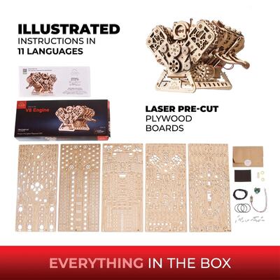 Der V8-Motor von Ugears hat den Schwierigkeitsgrad Fortgeschritten und richtet sich an erfahrene Modellbauer/innen. Ihre Anstrengungen werden belohnt: Während Sie dieses realitätstreue Holzmodell eines Motors zusammenbauen und wenn Sie es danach in Betrieb setzen, werden Sie die Funktionsweise eines Verbrennungsmotors besser verstehen.