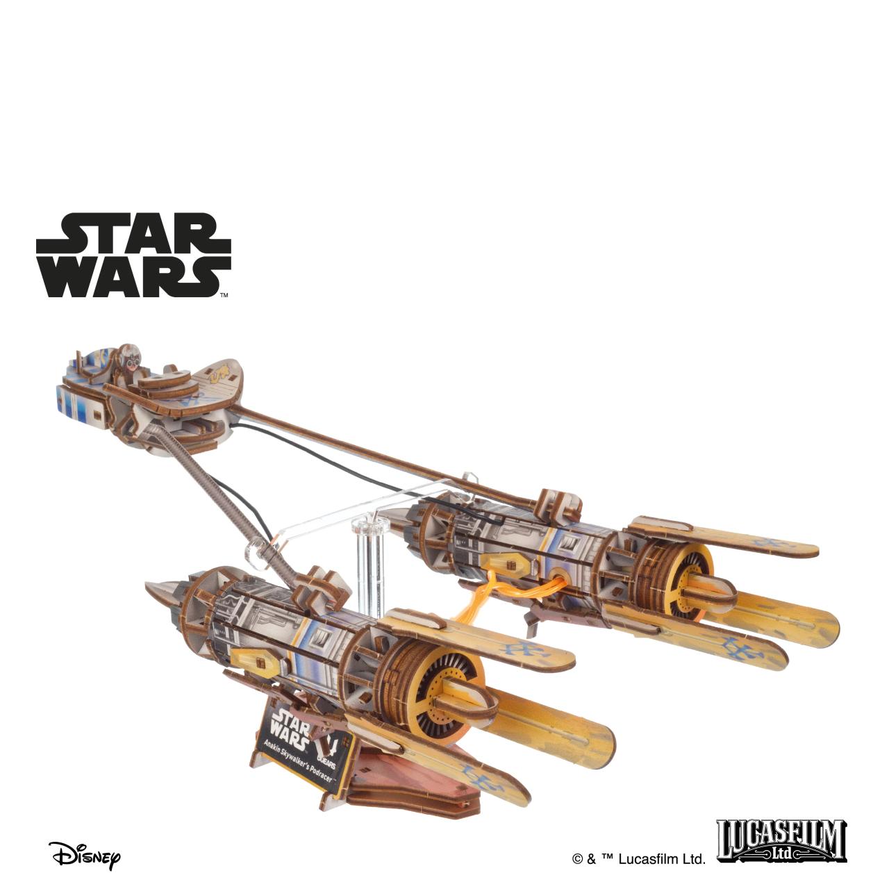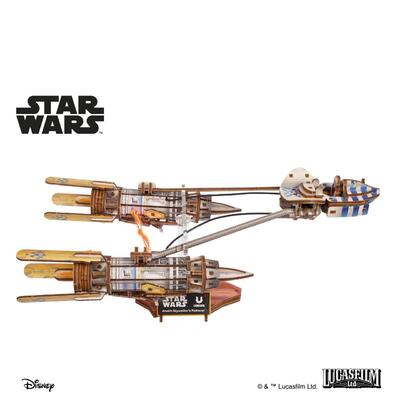 Anakin Skywalkers Podracer von Ugears fängt die Spannung des Podracings ein – mit einem einzigartigen Balanciermechanismus, der das Fahrzeug kippen, schwanken und wenden lässt und so den schwebenden Flug simuliert. Anakin Skywalker sitzt im Cockpit, deren Seitentür manuell geöffnet werden kann.