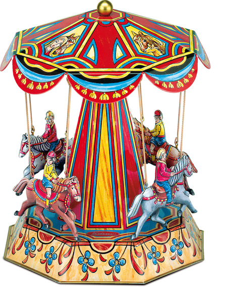 Nicht nur für Pferdeliebhaber ist dieses nostalgische Blechspielzeug ein Traum. Das Jahrmarktmodell besteht aus bedrucktem und lackiertem Weißblech „Made in Germany“. Das Weißblech bildet die Basis für unsere Aufzugsmodelle, die wir in liebevoller Handarbeit in einer kleinen Manufaktur in Süddeutschland fertigen lassen. Bei der Herstellung achten wir besonders auch darauf, dass keine scharfen Kanten zurückbleiben. Mittels eines Hebels im Fuß des Karussells lässt sich das nostalgische Spielzeug in Bewegung versetzen. Kaum aufgezogen, heben die detailgetreu bemalten Pferde mit ihren Reitern ab und galoppieren um das Karussell. Werfen Sie doch einmal einen Blick auf die Motive auf dem Dach des Karussells: Auch hier finden sich die Motive „Pferd“ und „Pferd mit Mädchen“ wieder. Dieses wunderschöne Sammlerstück eignet sich hervorragend auch als besonderes Präsent. Die Lieferung erfolgt in einem schlichten Umkarton.